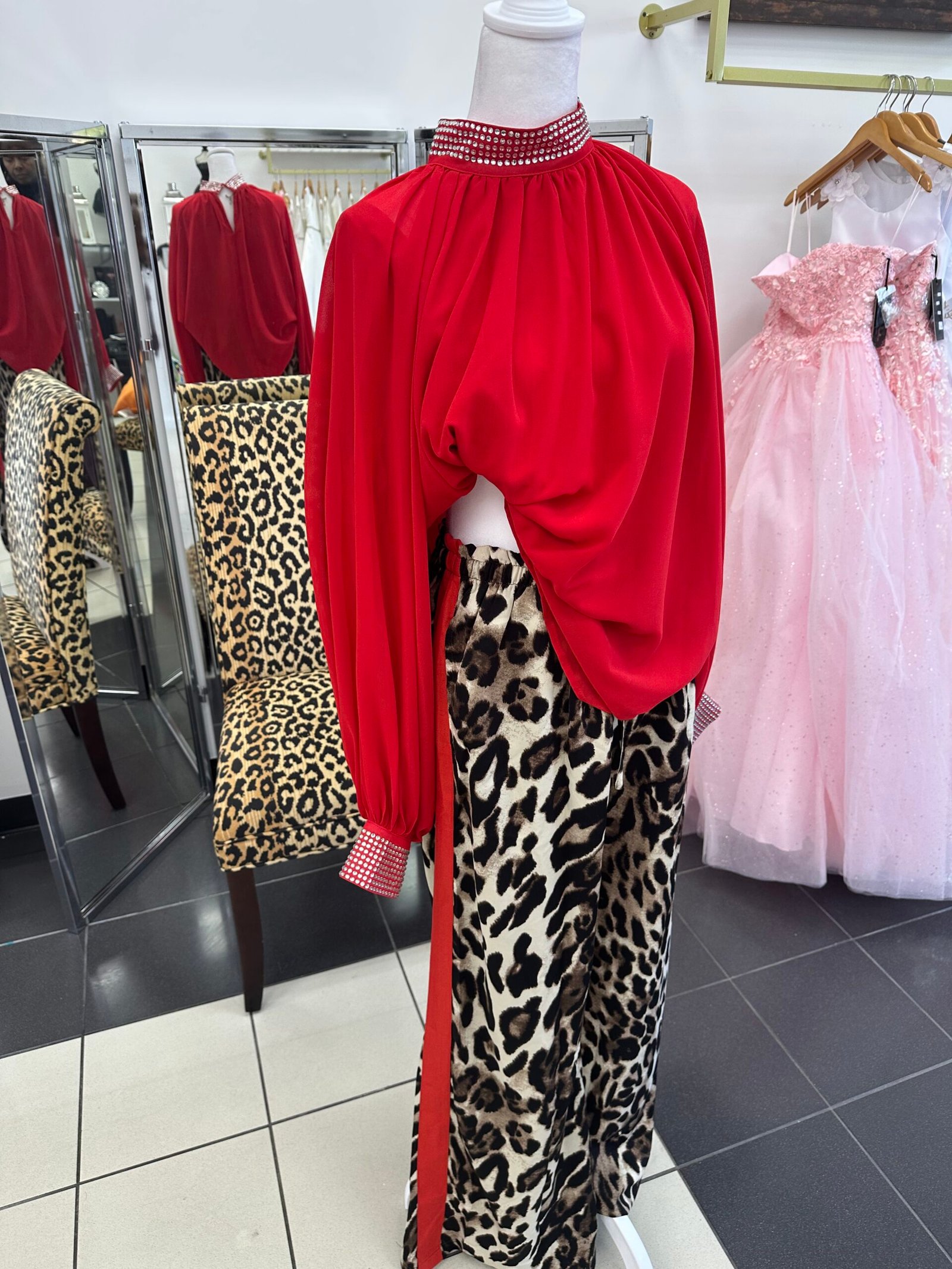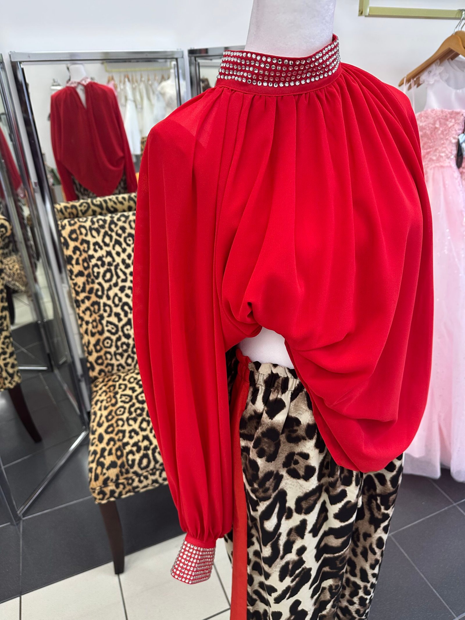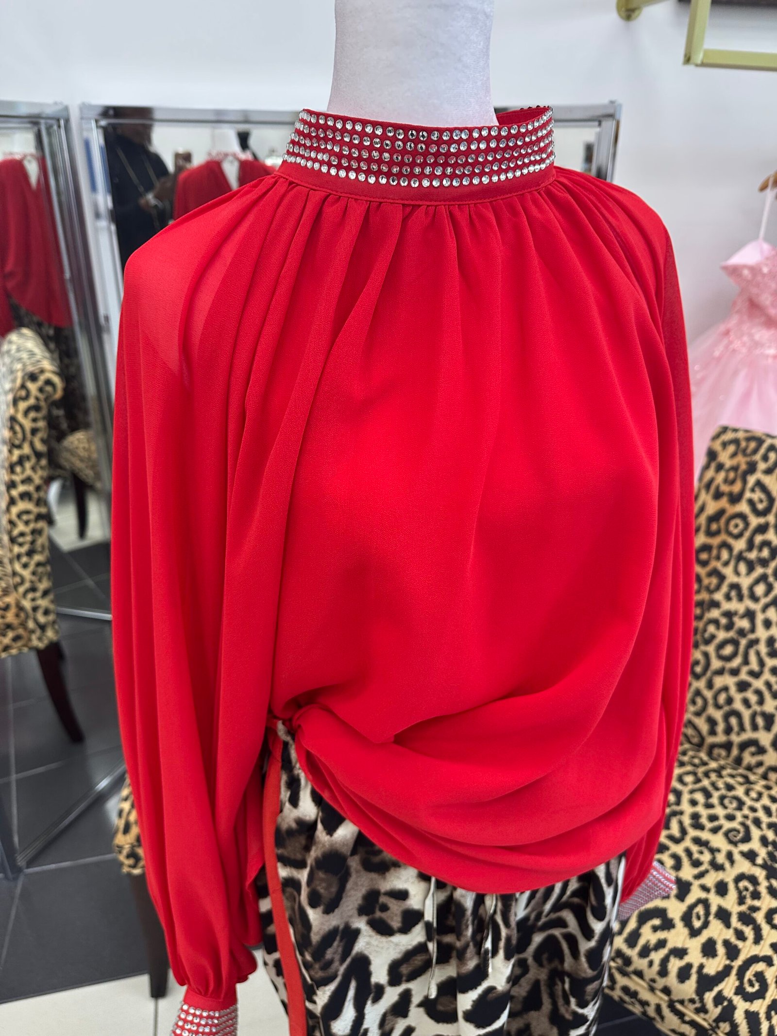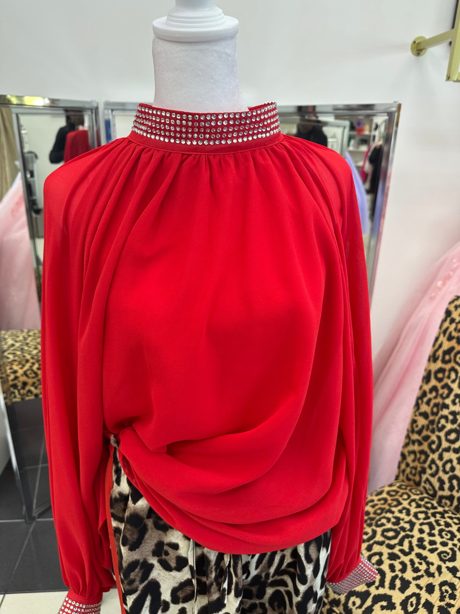 Red rhinestone high neck and cuffed bell sleeves with button closure in the back.