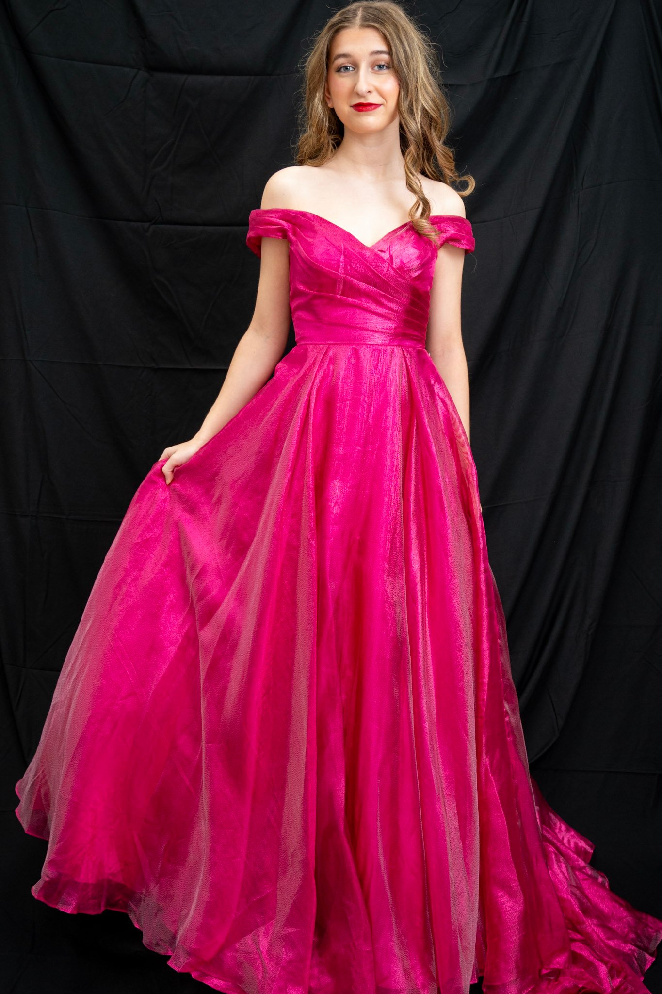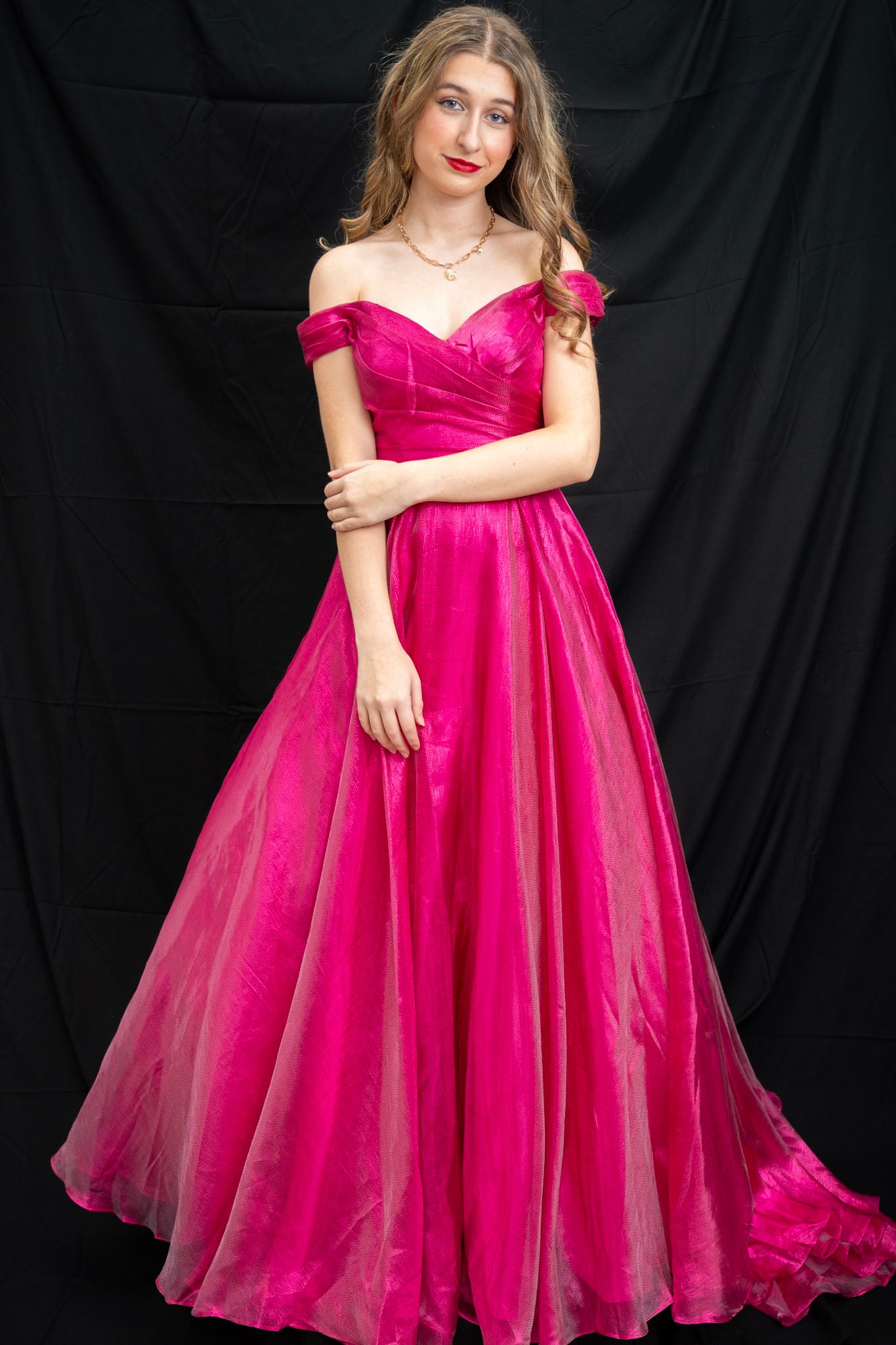 Fushia off the shoulder full ball gown with built in underskirt
